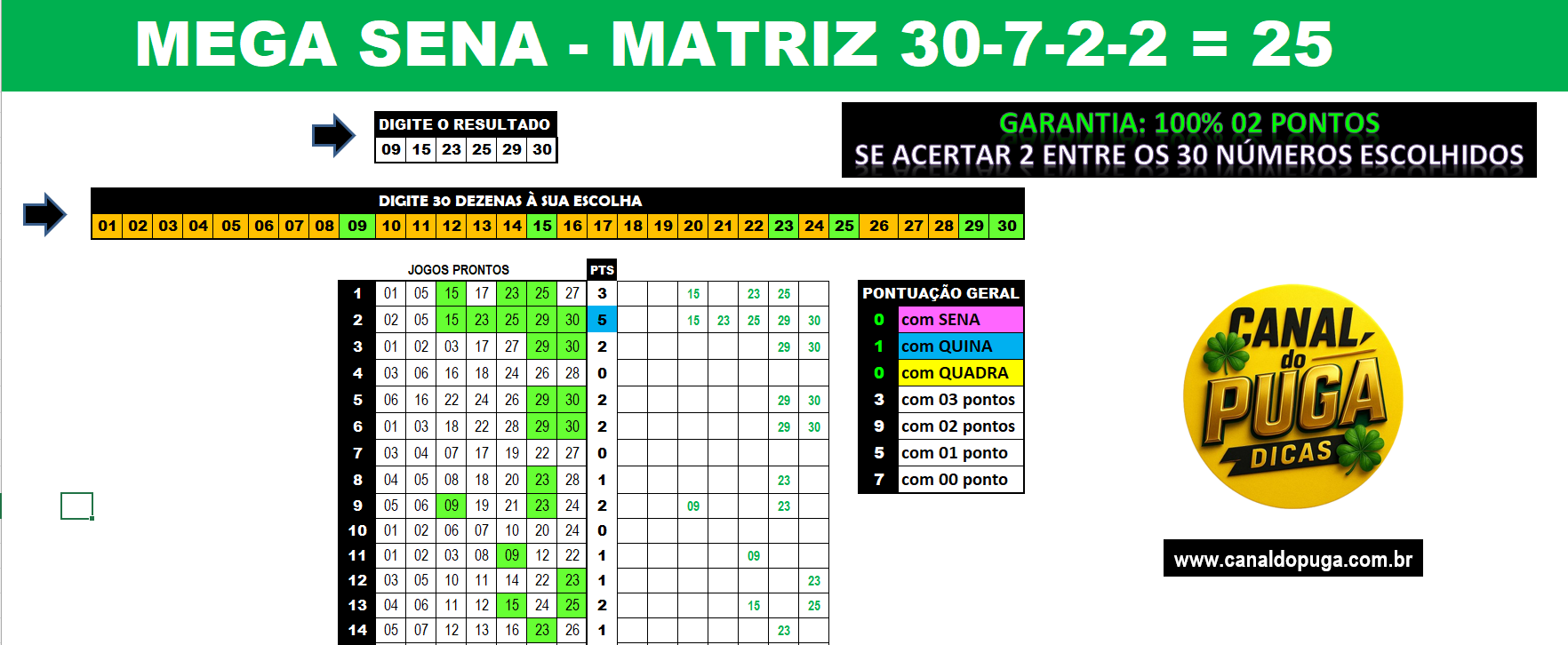 - ESCOLHA 30 DEZENAS DE SUA PREFERÊNCIA E A PLANILHA ELABORA DE FORMA AUTOMÁTICA 25 JOGOS DE 7 NÚMEROS COMBINADOS MATEMATICAMENTE.